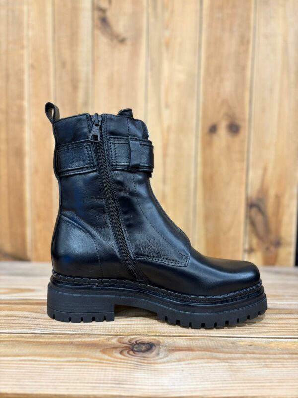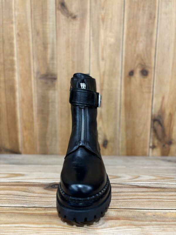 Fermeture éclaire décorative sur le devant de la chaussure avec boucle sur le côté extérieur.