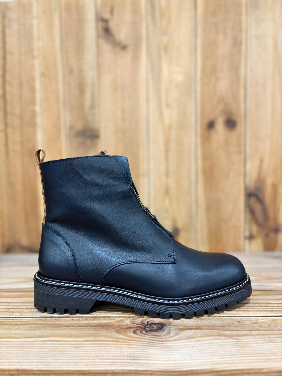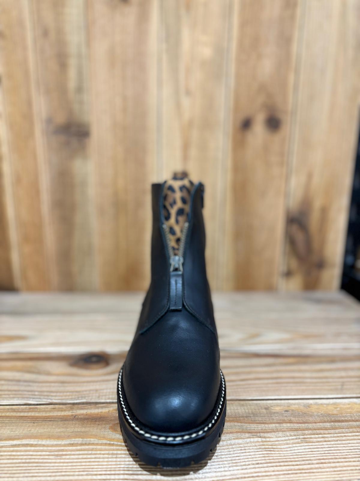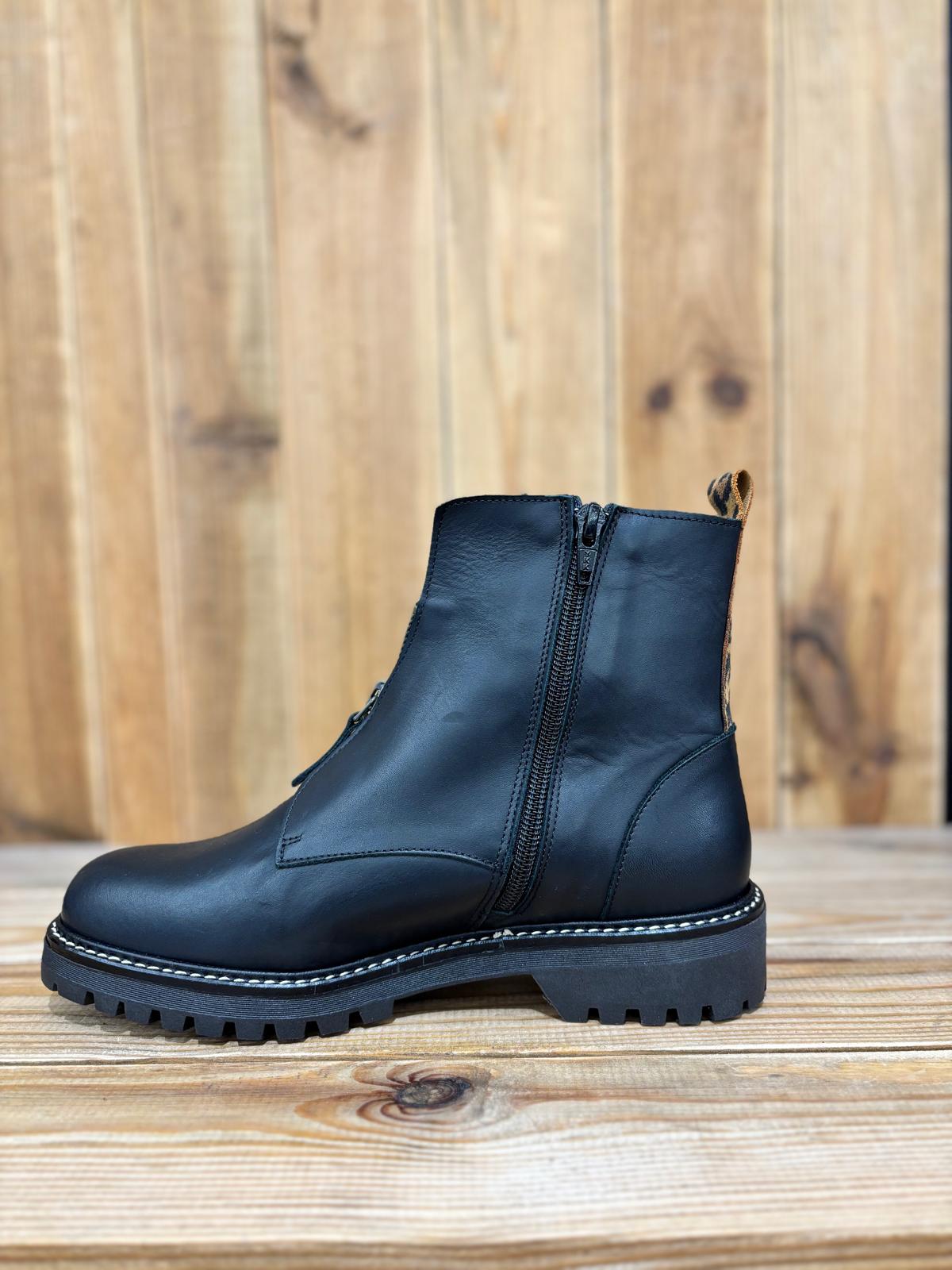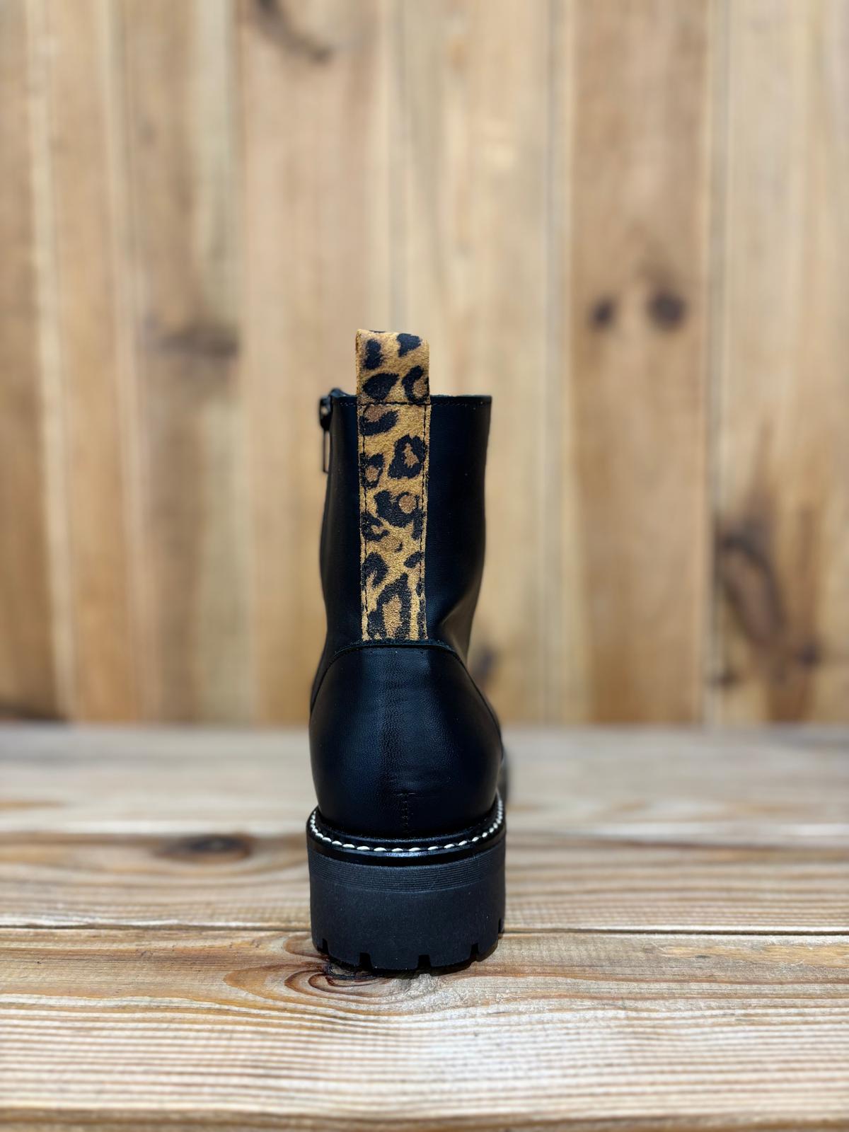 Boots Dickson Reqins en cuir lisse noir avec empiècement motif léopard sur la tige arrière et sur la languette.